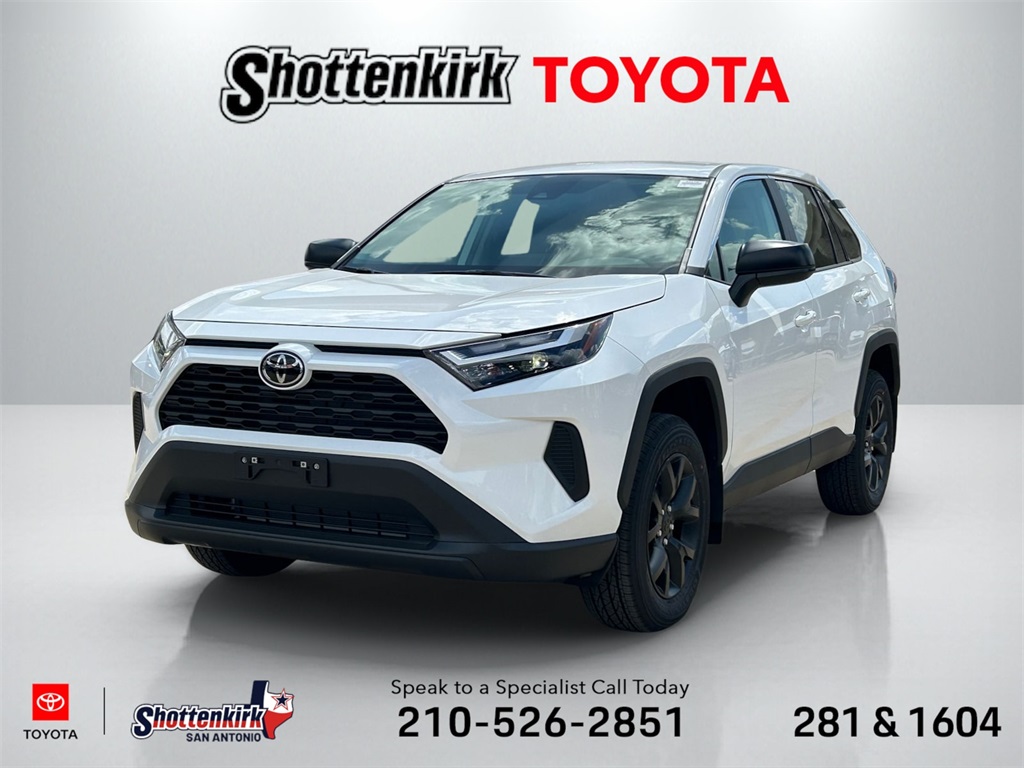 2025 Toyota RAV4 LE Black w/Fabric Seat Trim, 17" Steel Wheels, 4-Wheel Disc Brakes, 6 Speakers, ABS brakes, Air Conditioning, AM/FM radio: SiriusXM, Auto High-beam Headlights, Brake assist, Bumpers: body-color, Driver door bin, Driver vanity mirror, Dual front impact airbags, Dual front side impact airbags, Electronic Stability Control, Emergency communication system: Safety Connect (10-year trial), Exterior Parking Camera Rear, Fabric Seat Trim, Four wheel independent suspension, Front anti-roll bar, Front Bucket Seats, Front Center Armrest, Front reading lights, Illuminated entry, Knee airbag, Low tire pressure warning, Occupant sensing airbag, Outside temperature display, Overhead airbag, Overhead console, Panic alarm, Passenger door bin, Passenger vanity mirror, Power door mirrors, Power steering, Power windows, Radio data system, Radio: AM/FM/XM Audio System, Rear anti-roll bar, Rear seat center armrest, Rear window defroster, Rear window wiper, Remote keyless entry, Speed control, Speed-sensing steering, Split folding rear seat, Spoiler, Steering wheel mounted audio controls, Tachometer, Telescoping steering wheel, Tilt steering wheel, Traction control, Trip computer. 27/35 City/Highway MPGHere at Toyota San Antonio we offer game changing prices and a game changing buying experience. We deliver! Ask about our Toyota Express Buying Program! 1604 & 281.Welcome to Shottenkirk Toyota,. Here at Shottenkirk, we build relationships based on trust and integrity to exceed your expectations in your ownership experience. Quite simply, we strive to Make Confidence Happen! So stop by and allow us to serve your automotive needs; we would love to meet you. Joining the ToyotaCare1 family ensures that your vehicle is maintained with Toyota Genuine Parts and serviced by factory trained Toyota technicians. That's why we include a maintenance plan with the purchase or lease of every new Toyota vehicle, for 2 years or 25,000 miles, whichever comes first.