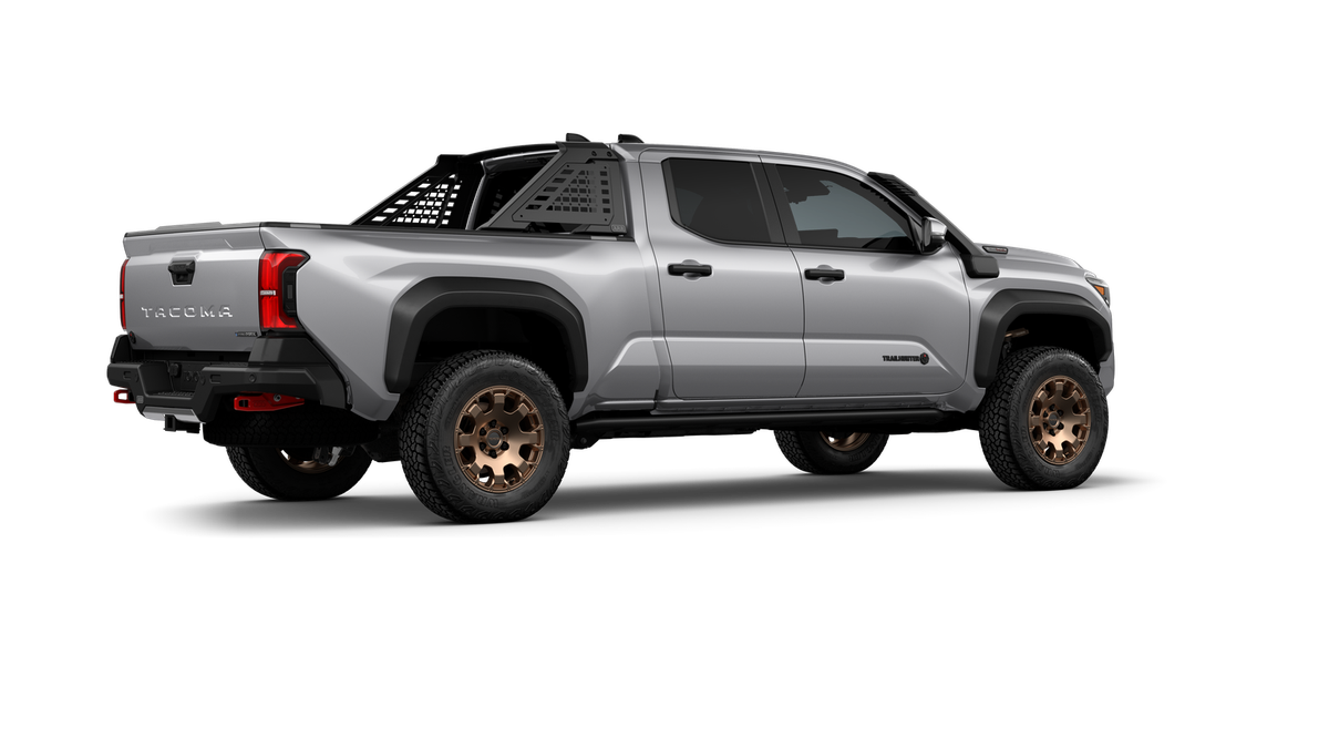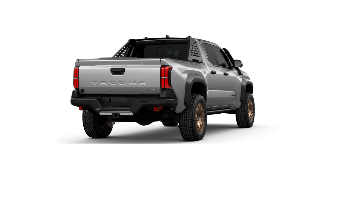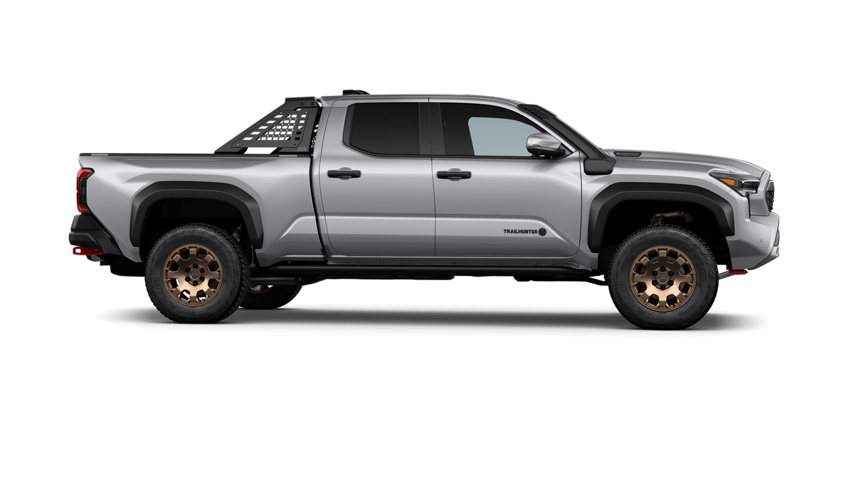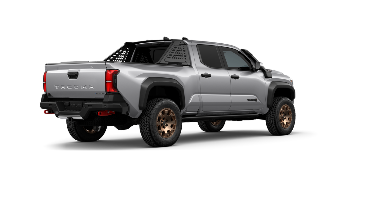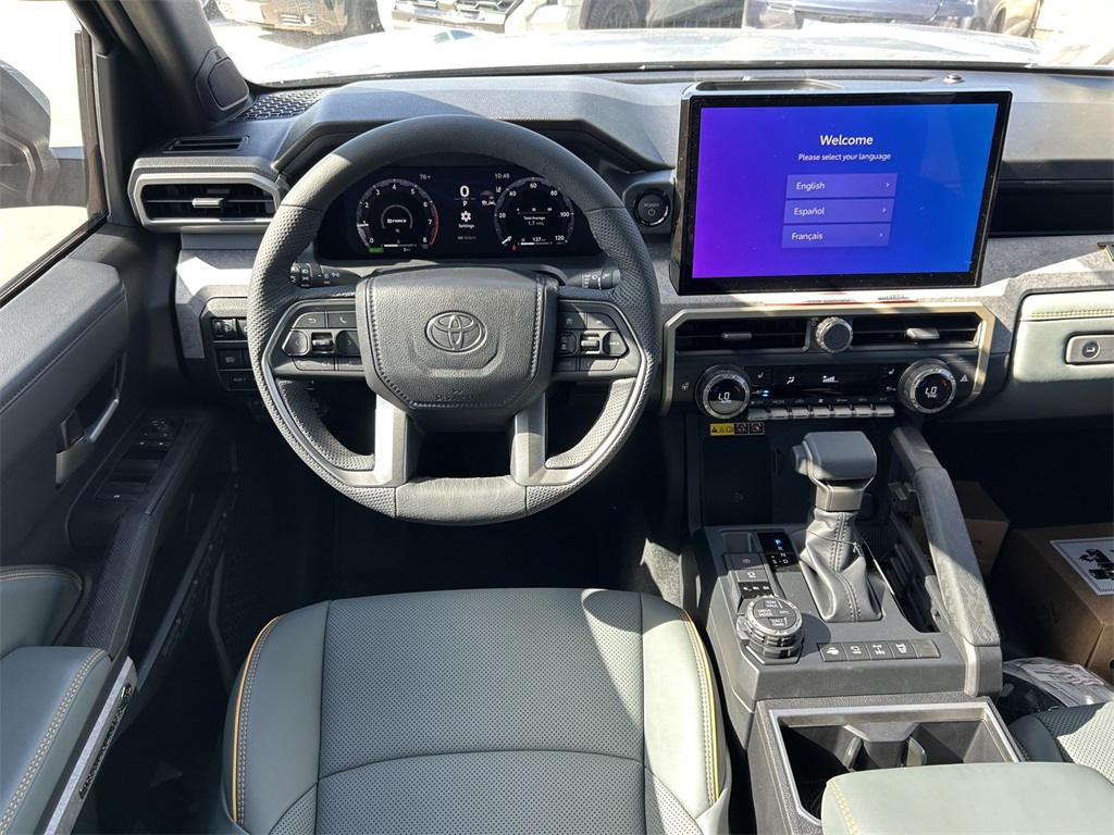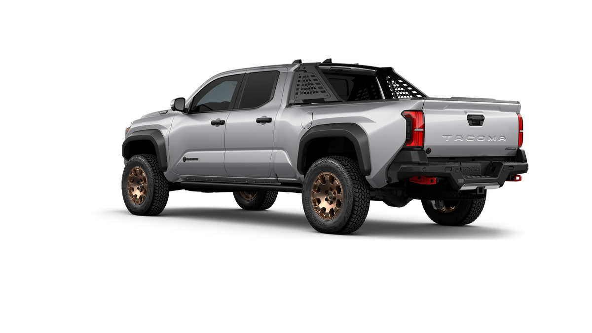 2025 Toyota Tacoma Hybrid Trailhunter 2.4L I4 PDI Hybrid Turbocharged DOHC 16V, 3.583 Axle Ratio, 4-Wheel Disc Brakes, 9 Speakers, ABS brakes, Air Conditioning, Alloy wheels, AM/FM radio: SiriusXM, Anti-whiplash front head restraints, Apple CarPlay/Android Auto, ARB Bed Rack HD Kit w/Molle Panels (TMS), Auto High-beam Headlights, Auto-dimming Rear-View mirror, Automatic temperature control, Bed Mat (TMS), Brake assist, Bumpers: body-color, Driver door bin, Driver vanity mirror, Dual front impact airbags, Dual front side impact airbags, Electronic Stability Control, Emergency communication system: Safety Connect (1-year trial), Exterior Parking Camera Rear, Four wheel independent suspension, Front anti-roll bar, Front Bucket Seats, Front Center Armrest, Front dual zone A/C, Front fog lights, Front reading lights, Fully automatic headlights, Garage door transmitter: HomeLink, Heads-Up Display, Heated & Ventilated Front Bucket Seats, Heated door mirrors, Heated front seats, Heated steering wheel, Illuminated entry, JBL Premium Audio, Knee airbag, Leather Shift Knob, Leather steering wheel, Low tire pressure warning, Navigation system: Drive Connect (1 year trial) includes Cloud Navigation with real time traffic and Google POI, Occupant sensing airbag, Outside temperature display, Overhead airbag, Overhead console, Panic alarm, Passenger door bin, Passenger vanity mirror, Power door mirrors, Power driver seat, Power passenger seat, Power steering, Power windows, Radio: 14" Toyota Audio Multimedia, Rear anti-roll bar, Rear step bumper, Rear window defroster, Remote keyless entry, Roof Rack (TMS), Security system, SofTex Seat Trim, Speed control, Speed-sensing steering, Split folding rear seat, Steering wheel mounted audio controls, Tachometer, Telescoping steering wheel, Tilt steering wheel, Tow Tech Package, Traction control, Trailhunter Package, Trip computer, Turn signal indicator mirrors, Variably intermittent wipers, Ventilated front seats, Wheels: 18" Bronze-Finished Trailhunter Alloy.