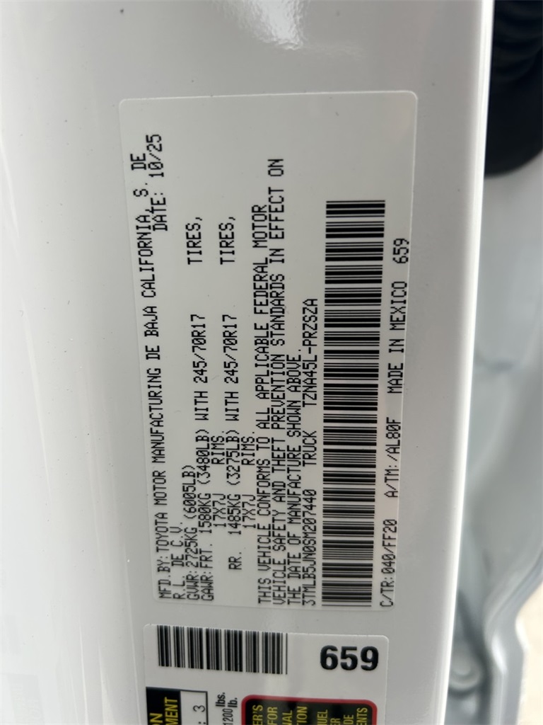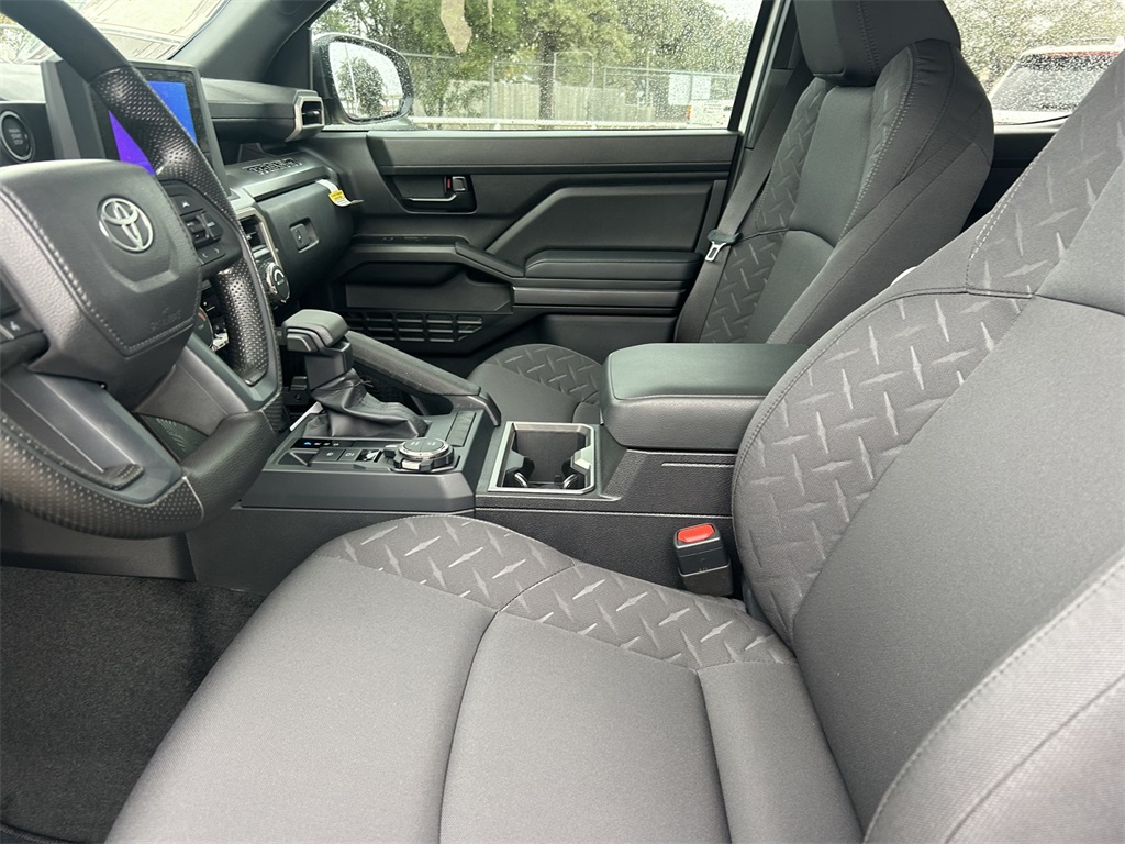 2025 Toyota Tacoma SR5 4WD, 3.583 Axle Ratio, 4-Wheel Disc Brakes, 6 Speakers, ABS brakes, Air Conditioning, Alloy wheels, AM/FM radio: SiriusXM, Anti-whiplash front head restraints, Apple CarPlay/Android Auto, Auto High-beam Headlights, Auto-dimming Rear-View mirror, Brake assist, Bumpers: body-color, Driver door bin, Dual front impact airbags, Dual front side impact airbags, Electronic Stability Control, Emergency communication system: Safety Connect (1-year trial), Exterior Parking Camera Rear, Fabric Seat Trim, Four wheel independent suspension, Front anti-roll bar, Front Bucket Seats, Front Center Armrest, Front fog lights, Front reading lights, Fully automatic headlights, Heated door mirrors, Illuminated entry, JBL Premium Audio, Knee airbag, Low tire pressure warning, Occupant sensing airbag, Outside temperature display, Overhead airbag, Overhead console, Panic alarm, Passenger door bin, Power door mirrors, Power steering, Power windows, Radio: 8" Toyota Audio Multimedia, Rear step bumper, Rear window defroster, Remote keyless entry, Speed control, Speed-sensing steering, Split folding rear seat, Spray-On Bed Liner (TMS), Steering wheel mounted audio controls, Tachometer, Telescoping steering wheel, Tilt steering wheel, Traction control, Trip computer, Variably intermittent wipers, Wheels: 17" Styled Alloy.