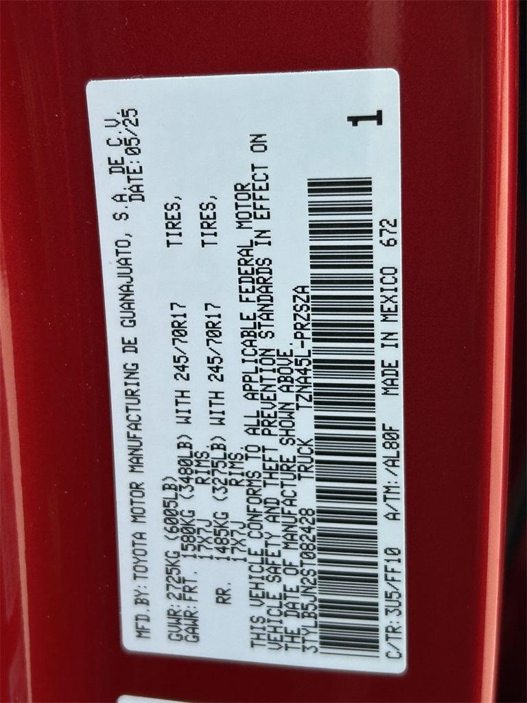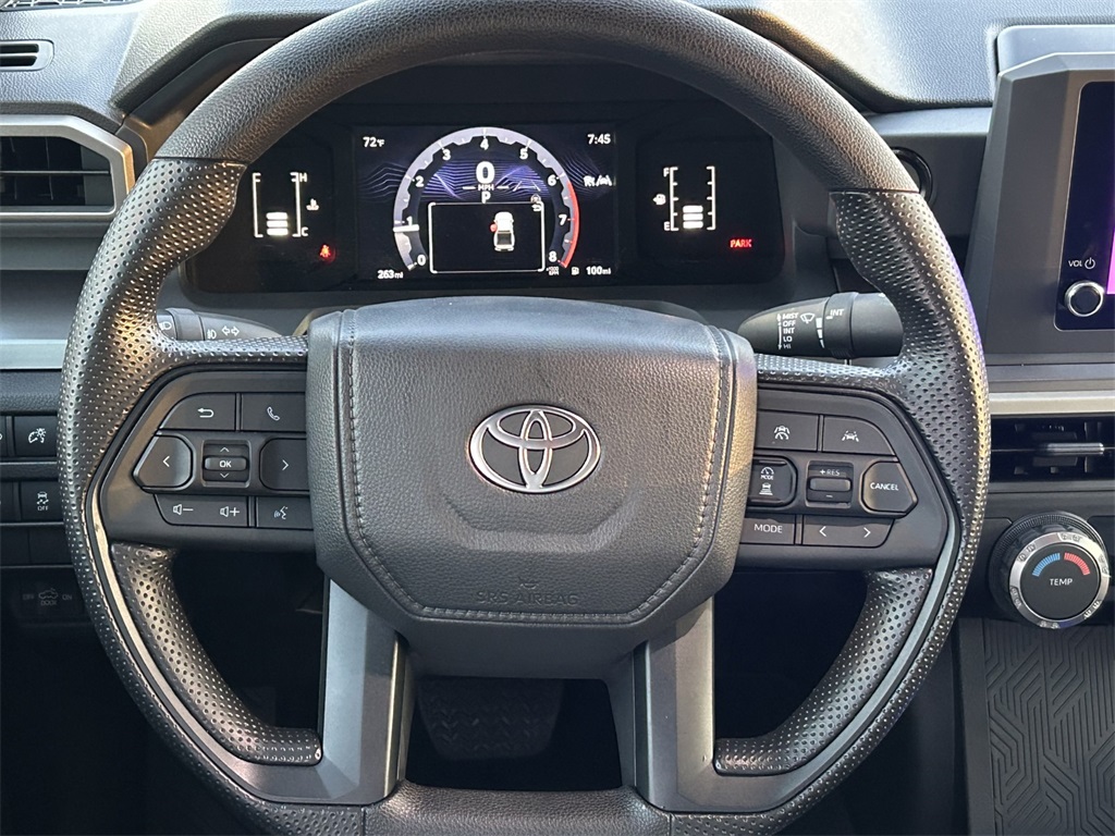 2025 Toyota Tacoma SR5 4WD, 3.583 Axle Ratio, 4-Wheel Disc Brakes, 6 Speakers, ABS brakes, Air Conditioning, Alloy wheels, AM/FM radio: SiriusXM, Anti-whiplash front head restraints, Apple CarPlay/Android Auto, Auto High-beam Headlights, Auto-dimming Rear-View mirror, Bed Step (TMS), Brake assist, Bumpers: body-color, Driver door bin, Dual front impact airbags, Dual front side impact airbags, Electronic Stability Control, Emergency communication system: Safety Connect (1-year trial), Exterior Parking Camera Rear, Fabric Seat Trim, Four wheel independent suspension, Front anti-roll bar, Front Bucket Seats, Front Center Armrest, Front fog lights, Front reading lights, Fully automatic headlights, Heated door mirrors, Illuminated entry, JBL Premium Audio, Knee airbag, Low tire pressure warning, Occupant sensing airbag, Outside temperature display, Overhead airbag, Overhead console, Panic alarm, Passenger door bin, Power door mirrors, Power steering, Power windows, Predator Step (TMS), Radio: 8" Toyota Audio Multimedia, Rear step bumper, Rear window defroster, Remote keyless entry, Speed control, Speed-sensing steering, Split folding rear seat, Spray-On Bed Liner (TMS), Steering wheel mounted audio controls, Tachometer, Telescoping steering wheel, Tilt steering wheel, Traction control, Trip computer, Variably intermittent wipers, Wheels: 17" Styled Alloy.