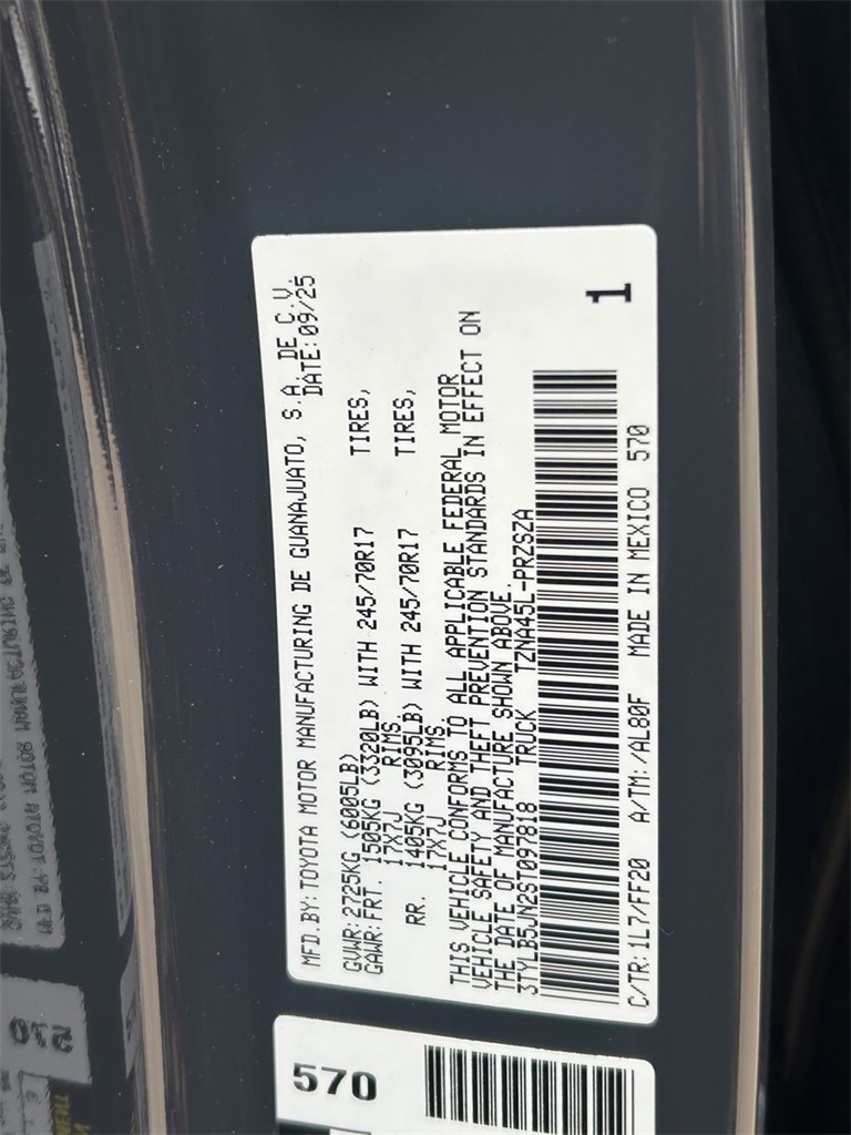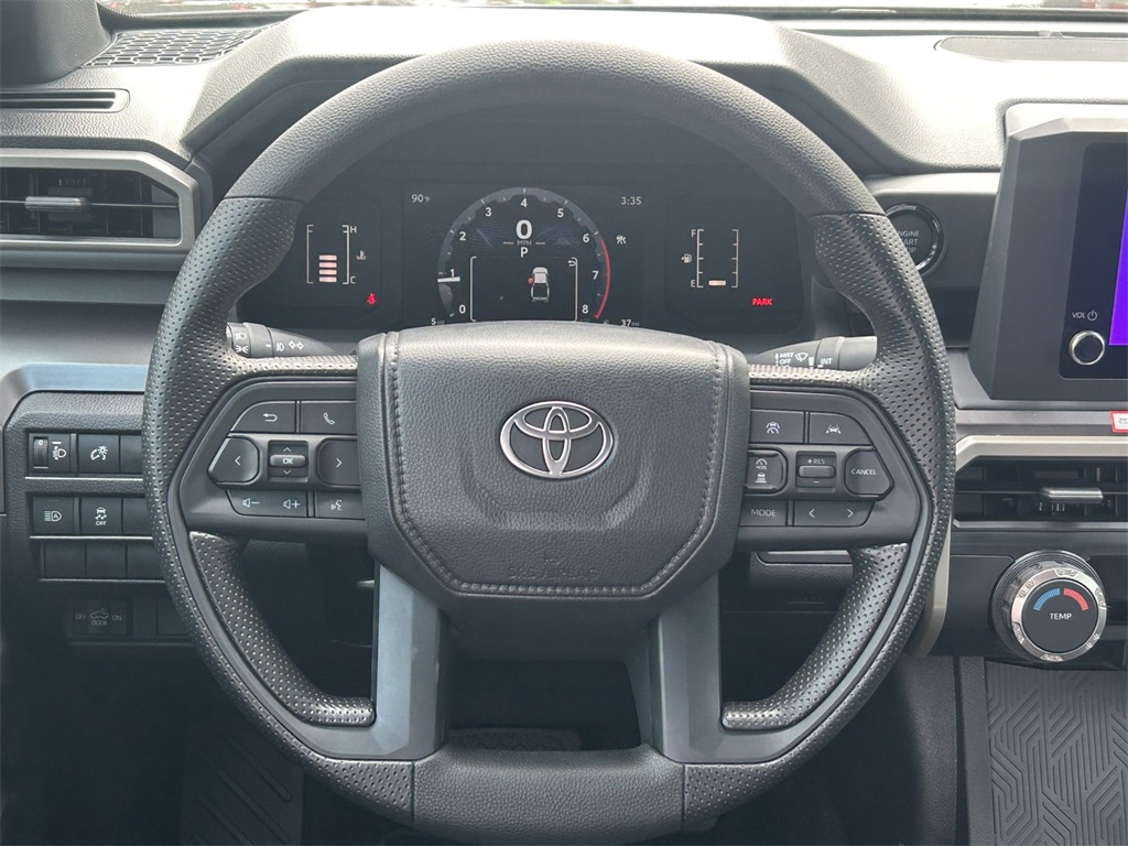 2025 Toyota Tacoma SR5 4WD, 3.583 Axle Ratio, 4-Wheel Disc Brakes, 6 Speakers, ABS brakes, Air Conditioning, Alloy wheels, AM/FM radio: SiriusXM, Anti-whiplash front head restraints, Apple CarPlay/Android Auto, Auto High-beam Headlights, Auto-dimming Rear-View mirror, Brake assist, Bumpers: body-color, Driver door bin, Dual front impact airbags, Dual front side impact airbags, Electronic Stability Control, Emergency communication system: Safety Connect (1-year trial), Exterior Parking Camera Rear, Fabric Seat Trim, Four wheel independent suspension, Front anti-roll bar, Front Bucket Seats, Front Center Armrest, Front fog lights, Front reading lights, Fully automatic headlights, Heated door mirrors, Illuminated entry, JBL Premium Audio, Knee airbag, Low tire pressure warning, Occupant sensing airbag, Outside temperature display, Overhead airbag, Overhead console, Panic alarm, Passenger door bin, Power door mirrors, Power steering, Power windows, Radio: 8" Toyota Audio Multimedia, Rear step bumper, Rear window defroster, Remote keyless entry, Speed control, Speed-sensing steering, Split folding rear seat, Spray-On Bed Liner (TMS), Steering wheel mounted audio controls, Tachometer, Telescoping steering wheel, Tilt steering wheel, Traction control, Trip computer, Variably intermittent wipers, Wheels: 17" Styled Alloy.