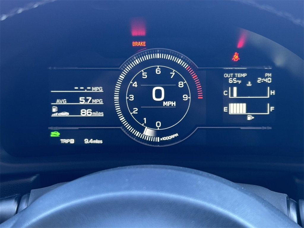 - 7-in. Thin-Film Transistor (TFT) GR digital gauge cluster with LCD Multi-Information Display (MID); GR logo and boxer engine animations on start-up; and the following vehicle data: central tachometer with Sport and Track Modes, odometer, twin tripmeters, outside ambient temperature, engine coolant/oil temperatures, average trip speed, driving time and miles covered, stopwatch/lap timer, current/average fuel consumption, rpm and hp/torque curves, instantaneous and historical G-force friction circle with digital readout