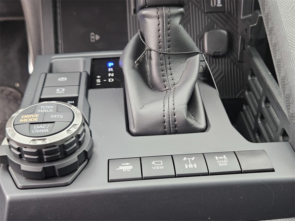 - TRD Pro leather-trimmed manual tilt/telescopic steering wheel with TRD badge, red center stripe, and phone, audio, display/infotainment, and Driver Assist controls