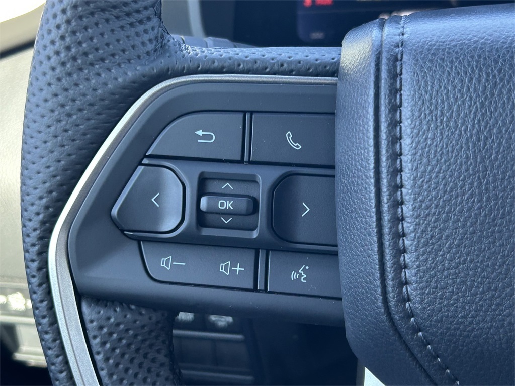 - Leather-wrapped manual tilt/telescopic steering wheel with phone, audio, display/infotainment, and Driver Assist controls