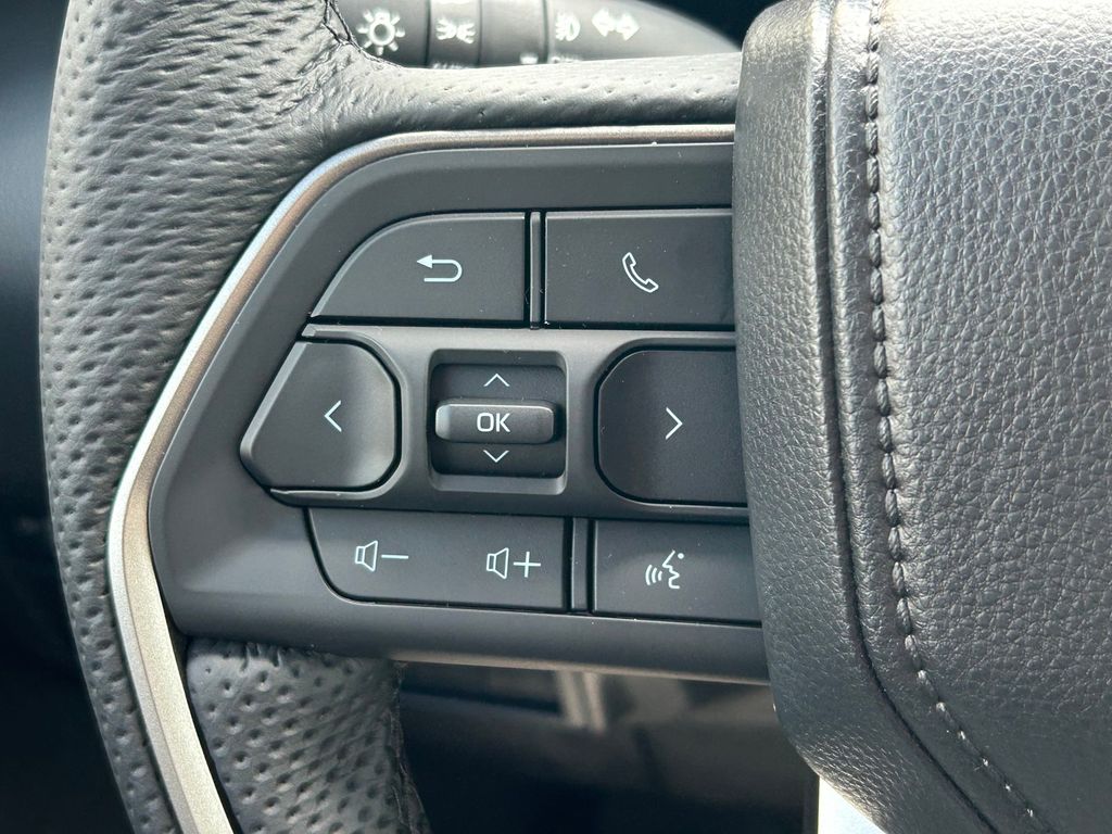 - Leather-wrapped manual tilt/telescopic steering wheel with phone, audio, display/infotainment, and Driver Assist controls