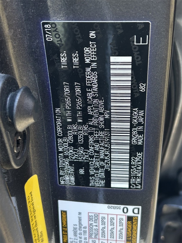 Graphite Leather, 15 Speakers, 20" x 7.5" Unique Dual 6-Spoke Alloy Wheels, 3.727 Axle Ratio, 4-Wheel Disc Brakes, ABS brakes, Air Conditioning, Alloy wheels, AM/FM radio: SiriusXM, Anti-whiplash front head restraints, Auto-Dimming Rear-View Mirror, Auto-dimming Rear-View mirror, Automatic temperature control, Body Color Heated Mirrors, Brake assist, Bumpers: body-color, CD player, Compass, Delay-off headlights, Driver door bin, Driver vanity mirror, Dual front impact airbags, Dual front side impact airbags, Electronic Stability Control, Emergency communication system: Safety Connect, Exterior Parking Camera Rear, Front anti-roll bar, Front Bucket Seats, Front Center Armrest, Front dual zone A/C, Front fog lights, Front reading lights, Front wheel independent suspension, Fully automatic headlights, Garage Door Opener, Garage door transmitter: HomeLink, Heated door mirrors, Heated front seats, Heated/Ventilated Front Bucket Seats, Illuminated entry, Knee airbag, Leather Seat Trim, Leather Shift Knob, Low tire pressure warning, Memory seat, Moonroof w/Tilt Up & Slide, Navigation System, Occupant sensing airbag, Outside temperature display, Overhead airbag, Overhead console, Panic alarm, Passenger door bin, Passenger vanity mirror, Power door mirrors, Power driver seat, Power moonroof, Power passenger seat, Power steering, Power windows, Radio: Entune Premium JBL Audio w/Navigation, Rear anti-roll bar, Rear seat center armrest, Rear window defroster, Rear window wiper, Remote keyless entry, Right & Left Individual Air Conditioner, Roof rack: rails only, Security system, Speed control, Speed-sensing steering, Split folding rear seat, Spoiler, Steering wheel mounted audio controls, Tachometer, Telescoping steering wheel, Tilt steering wheel, Traction control, Trip computer, Turn signal indicator mirrors, Variably intermittent wipers, Ventilated front seats.