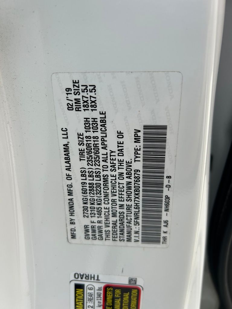 3rd row seats: split-bench, 4-Wheel Disc Brakes, 4.33 Axle Ratio, 7 Speakers, A/V remote: CabinControl, ABS brakes, Air Conditioning, Alloy wheels, AM/FM radio: SiriusXM, Anti-whiplash front head restraints, Apple CarPlay/Android Auto, Auto High-beam Headlights, Auto-dimming Rear-View mirror, Automatic temperature control, Blind Spot Information (BSI) System warning, Brake assist, Bumpers: body-color, Delay-off headlights, Driver door bin, Driver vanity mirror, Driver's Seat Mounted Armrest, Dual front impact airbags, Dual front side impact airbags, Electronic Stability Control, Emergency communication system: HondaLink, Exterior Parking Camera Rear, Forward collision: Collision Mitigation Braking System (CMBS) + FCW mitigation, Four wheel independent suspension, Front anti-roll bar, Front Bucket Seats, Front dual zone A/C, Front fog lights, Front reading lights, Fully automatic headlights, Garage door transmitter: HomeLink, Heated door mirrors, Heated Front Bucket Seats, Heated front seats, Illuminated entry, Knee airbag, Lane departure: Lane Keeping Assist System (LKAS) active, Leather Seat Trim, Leather steering wheel, Low tire pressure warning, Memory seat, Occupant sensing airbag, Outside temperature display, Overhead airbag, Overhead console, Panic alarm, Passenger door bin, Passenger seat mounted armrest, Passenger vanity mirror, Power door mirrors, Power driver seat, Power Liftgate, Power moonroof, Power passenger seat, Power steering, Power windows, Radio data system, Radio: 160-Watt AM/FM/HD/SiriusXM Audio System, Rear air conditioning, Rear anti-roll bar, Rear reading lights, Rear seat center armrest, Rear window defroster, Rear window wiper, Reclining 3rd row seat, Remote keyless entry, Security system, Speed control, Speed-sensing steering, Speed-Sensitive Wipers, Split folding rear seat, Spoiler, Steering wheel mounted audio controls, Tachometer, Telescoping steering wheel, Tilt steering wheel, Traction control, Trip computer, Turn signal indicator mirrors, Variably intermittent wipers, Wheels: 18" Dark Silver-Painted Alloy.
