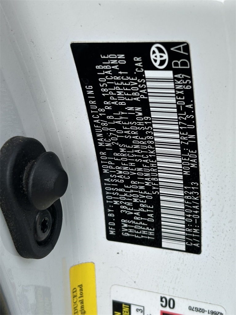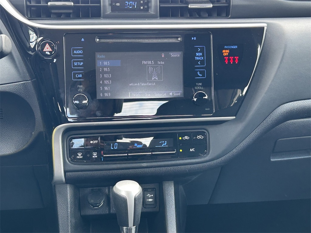6 Speakers, ABS brakes, Air Conditioning, AM/FM radio, Auto High-beam Headlights, Automatic temperature control, Brake assist, Bumpers: body-color, CD player, Delay-off headlights, Driver door bin, Driver vanity mirror, Dual front impact airbags, Dual front side impact airbags, Electronic Stability Control, Exterior Parking Camera Rear, Fabric Seat Trim, Front anti-roll bar, Front Bucket Seats, Front Center Armrest w/Storage, Front reading lights, Front wheel independent suspension, Fully automatic headlights, Heated door mirrors, Illuminated entry, Knee airbag, LED Daytime Running Lights (DRL), Low tire pressure warning, Occupant sensing airbag, Outside temperature display, Overhead airbag, Panic alarm, Passenger door bin, Passenger vanity mirror, Power door mirrors, Power steering, Power windows, Radio data system, Radio: Entune Audio Plus w/Connected Navigation, Radio: Entune Audio w/6.1" Screen, Rear anti-roll bar, Rear seat center armrest, Rear window defroster, Remote keyless entry, Speed control, Speed-sensing steering, Split folding rear seat, Steering wheel mounted audio controls, Tachometer, Telescoping steering wheel, Tilt steering wheel, Traction control, Trip computer, Variably intermittent wipers, Wheels: 16" x 6.5" Wide Vent Steel.