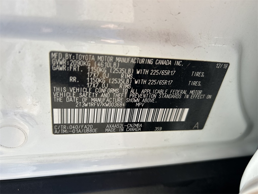 Black Cloth, 17" x 7.0J Alloy Wheels, 4-Wheel Disc Brakes, 6 Speakers, ABS brakes, Air Conditioning, Alloy wheels, AM/FM radio, Apple CarPlay, Auto High-beam Headlights, Automatic temperature control, Axle Ratio: 3.177, Brake assist, Bumpers: body-color, Delay-off headlights, Driver door bin, Driver vanity mirror, Dual front impact airbags, Dual front side impact airbags, Electronic Stability Control, Emergency communication system: Entune Safety Connect, Exterior Parking Camera Rear, Fabric Seat Trim, Four wheel independent suspension, Front anti-roll bar, Front Bucket Seats, Front Center Armrest, Front dual zone A/C, Front fog lights, Front reading lights, Fully automatic headlights, Heated door mirrors, Illuminated entry, Knee airbag, Low tire pressure warning, Occupant sensing airbag, Outside temperature display, Overhead airbag, Overhead console, Panic alarm, Passenger door bin, Passenger vanity mirror, Power door mirrors, Power moonroof, Power steering, Power windows, Radio data system, Radio: Entune 3.0 Audio, Rear anti-roll bar, Rear seat center armrest, Rear window defroster, Rear window wiper, Remote keyless entry, Roof rack: rails only, Speed control, Speed-sensing steering, Split folding rear seat, Spoiler, Steering wheel mounted audio controls, Tachometer, Telescoping steering wheel, Tilt steering wheel, Traction control, Trip computer, Turn signal indicator mirrors, Variably intermittent wipers.