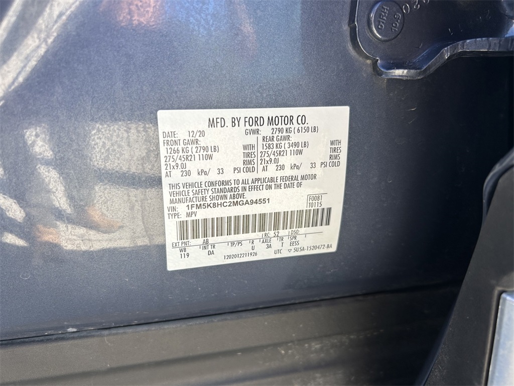 CARFAX One-Owner. 4WD, 10.1" LCD Capacitive Portrait Touchscreen, 12 Speakers, 2 Additional Speakers, 3.31 Non-Limited-Slip Axle Ratio, 3rd row seats: bench, 4-Wheel Disc Brakes, ABS brakes, Air Conditioning, Alloy wheels, AM/FM radio: SiriusXM, Auto High-beam Headlights, Auto-dimming door mirrors, Auto-dimming Rear-View mirror, Automatic temperature control, Brake assist, Bumpers: body-color, Compass, Delay-off headlights, Driver door bin, Driver vanity mirror, Dual front impact airbags, Dual front side impact airbags, Electronic Stability Control, Emergency communication system: SYNC 3 911 Assist, Equipment Group 601A, Exterior Parking Camera Rear, FordPass Connect, Four wheel independent suspension, Front & Second Row Floor Liners (16B), Front anti-roll bar, Front Bucket Seats, Front Center Armrest, Front dual zone A/C, Front fog lights, Front reading lights, Fully automatic headlights, Garage door transmitter: HomeLink, Genuine wood dashboard insert, Heated door mirrors, Heated front seats, Heated rear seats, Heated steering wheel, Illuminated entry, Knee airbag, Leather Htd/Ventilated Sport Captain's Chairs, Leather steering wheel, Low tire pressure warning, Memory seat, Navigation System, Occupant sensing airbag, Outside temperature display, Overhead airbag, Overhead console, Panic alarm, Passenger door bin, Passenger vanity mirror, Power door mirrors, Power driver seat, Power Liftgate, Power passenger seat, Power steering, Power windows, Premium Technology Package, Radio data system, Radio: B&O Sound System by Bang & Olufsen, Rain sensing wipers, Rear air conditioning, Rear anti-roll bar, Rear reading lights, Rear window defroster, Rear window wiper, Remote keyless entry, Roof rack: rails only, Security system, SelectShift Capability w/Paddle Shifters, Speed control, Speed-sensing steering, Speed-Sensitive Wipers, Split folding rear seat, Spoiler, Steering wheel memory, Steering wheel mounted audio controls, SYNC 3 Communications & Entertainment System, SYNC 3/Apple CarPlay/Android Auto, Tachometer, Telescoping steering wheel, Tilt steering wheel, Traction control, Trip computer, Turn signal indicator mirrors, Twin Panel Moonroof, Variably intermittent wipers, Ventilated front seats, Voice-Activated Touchscreen Navigation System, Wheels: 21" Bright Machined-Face Aluminum.