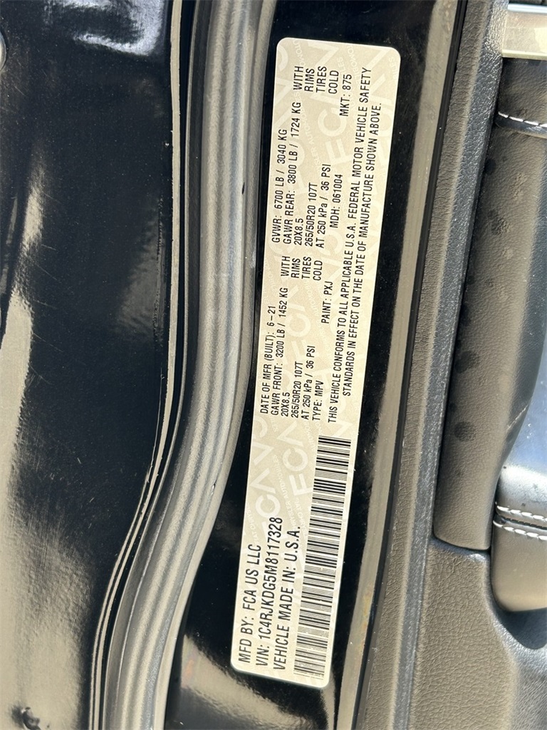 CARFAX One-Owner. 10 Speakers, 10.1" Touchscreen Display, 19 Speakers High Performance Audio, 2nd Row 60/40 Bench w/Manual Tip/Slide, 2nd Row Seat Center Armrest/Cupholders, 3 Rear Seat Head Restraints, 3.45 Rear Axle Ratio, 3rd row seats: split-bench, 4-Wheel Disc Brakes, 7-Passenger Seating, 950 Watt Amplifier, ABS brakes, Adaptive suspension, Air Conditioning, Alloy wheels, AM/FM radio: SiriusXM w/360L, Anti-whiplash front head restraints, Apple CarPlay, Apple CarPlay/Android Auto, Audio memory, Auto High-beam Headlights, Auto-dimming door mirrors, Auto-dimming Rear-View mirror, Auto-leveling suspension, Automatic temperature control, Aux Battery, Brake assist, Bumpers: body-color, Center Rear 3-Point Seat Belt, Compass, Connected Travel & Traffic Services, Connectivity - US/Canada, Delay-off headlights, Disassociated Touchscreen Display, Driver door bin, Driver vanity mirror, Dual front impact airbags, Dual front side impact airbags, Electronic Stability Control, Emergency communication system, Four wheel independent suspension, Front anti-roll bar, Front Bucket Seats, Front Center Armrest w/Storage, Front dual zone A/C, Front fog lights, Front License Plate Bracket (DISC), Front reading lights, Fully automatic headlights, Garage door transmitter, Google Android Auto, GPS Antenna Input, GPS Navigation, HD Radio, Heated door mirrors, Heated front seats, Heated rear seats, Heated steering wheel, Illuminated entry, Integrated Center Stack Radio, Integrated Voice Command w/Bluetooth, Knee airbag, Leather steering wheel, Low tire pressure warning, Memory seat, Nappa Leather Seats, Navigation System, Normal Duty Suspension, Occupant sensing airbag, Outside temperature display, Overhead airbag, Overhead console, Panic alarm, ParkView Rear Back-Up Camera, Passenger door bin, Passenger vanity mirror, Power door mirrors, Power driver seat, Power Fold Seatbacks, Power Liftgate, Power moonroof: CommandView, Power passenger seat, Power steering, Power windows, Quick Order Package 22N, Radio data system, Radio: Uconnect 5 Nav w/10.1" Display, Radio: Uconnect 5 Nav w/8.4" Display, Rain sensing wipers, Rear air conditioning, Rear anti-roll bar, Rear reading lights, Rear window defroster, Rear window wiper, Reclining 3rd row seat, Remote keyless entry, Roof rack: rails only, Security system, SiriusXM Satellite Radio, SiriusXM w/360L, Speed control, Speed-Sensitive Wipers, Split folding rear seat, Spoiler, Steering wheel memory, Steering wheel mounted audio controls, Tachometer, Telescoping steering wheel, Tilt steering wheel, Traction control, Trip computer, Turn signal indicator mirrors, USB Host Flip, Variably intermittent wipers, Ventilated front seats, Voltmeter, Wheels: 20" x 8.5" Machined Face Aluminum.