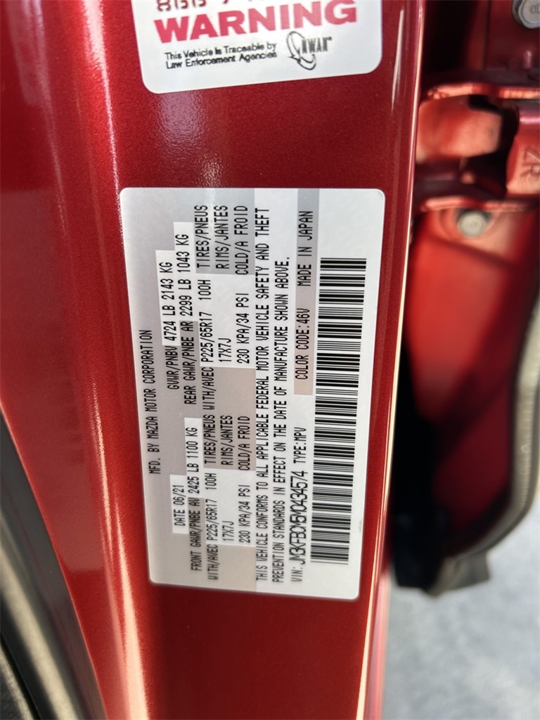 CARFAX One-Owner. 4-Wheel Disc Brakes, 4.624 Axle Ratio, ABS brakes, Air Conditioning, Alloy wheels, AppLink/Apple CarPlay and Android Auto, Auto High-beam Headlights, Automatic temperature control, Bose 10-Speaker Premium Audio Sound System, Brake assist, Bumpers: body-color, Cargo Mat, Delay-off headlights, Driver door bin, Driver vanity mirror, Dual front impact airbags, Dual front side impact airbags, Electronic Stability Control, Emergency communication system: MAZDA CONNECT, Exterior Parking Camera Rear, Four wheel independent suspension, Front anti-roll bar, Front Bucket Seats, Front Center Armrest, Front dual zone A/C, Front reading lights, Fully automatic headlights, Heated Front Bucket Seats, Heated front seats, Illuminated entry, Leather Seat Trim, Leather Shift Knob, Low tire pressure warning, Occupant sensing airbag, Outside temperature display, Overhead airbag, Overhead console, Panic alarm, Passenger door bin, Passenger vanity mirror, Power door mirrors, Power driver seat, Power steering, Power windows, Radio data system, Radio: AM/FM/HD Audio System, Rain sensing wipers, Rear anti-roll bar, Rear reading lights, Rear seat center armrest, Rear window defroster, Rear window wiper, Remote keyless entry, Speed control, Speed-sensing steering, Split folding rear seat, Spoiler, Steering wheel mounted audio controls, Tachometer, Telescoping steering wheel, Tilt steering wheel, Traction control, Trip computer, Turn signal indicator mirrors, Variably intermittent wipers.