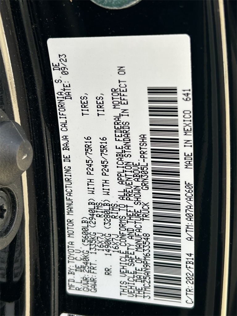 2023 Black Toyota Tacoma 3.5L V6 PDI DOHC 24V LEV3-ULEV70 278hp 4WD SR