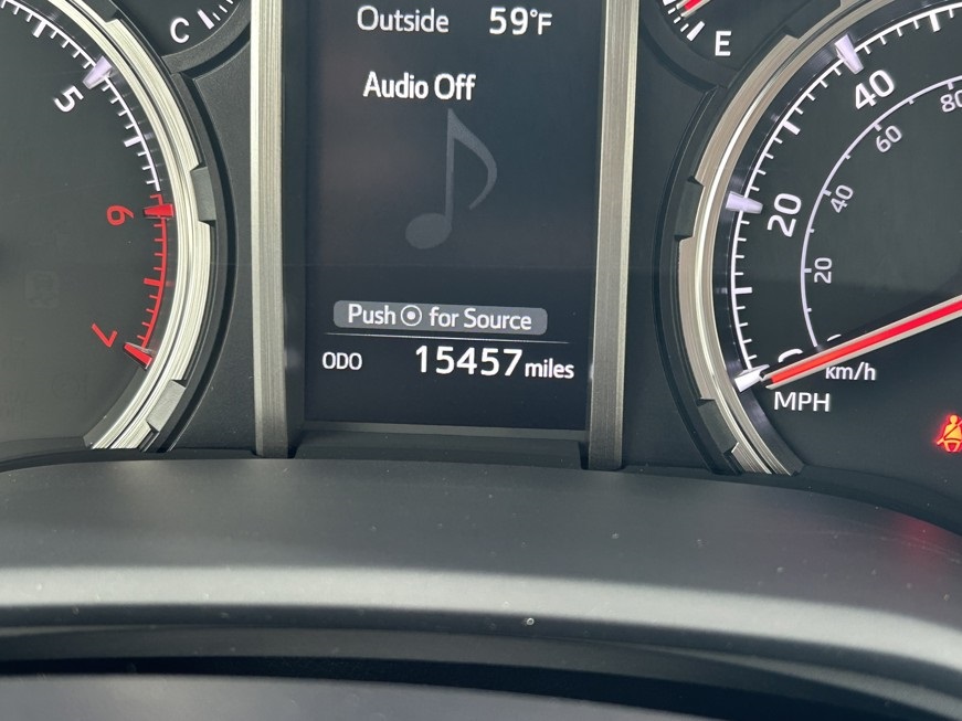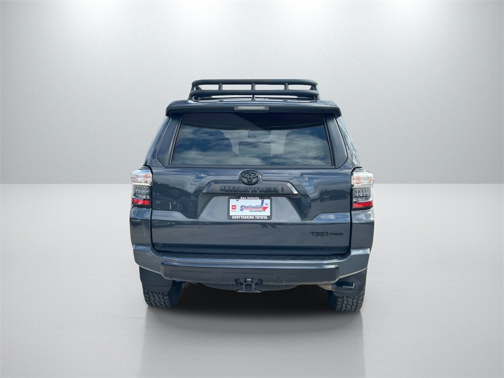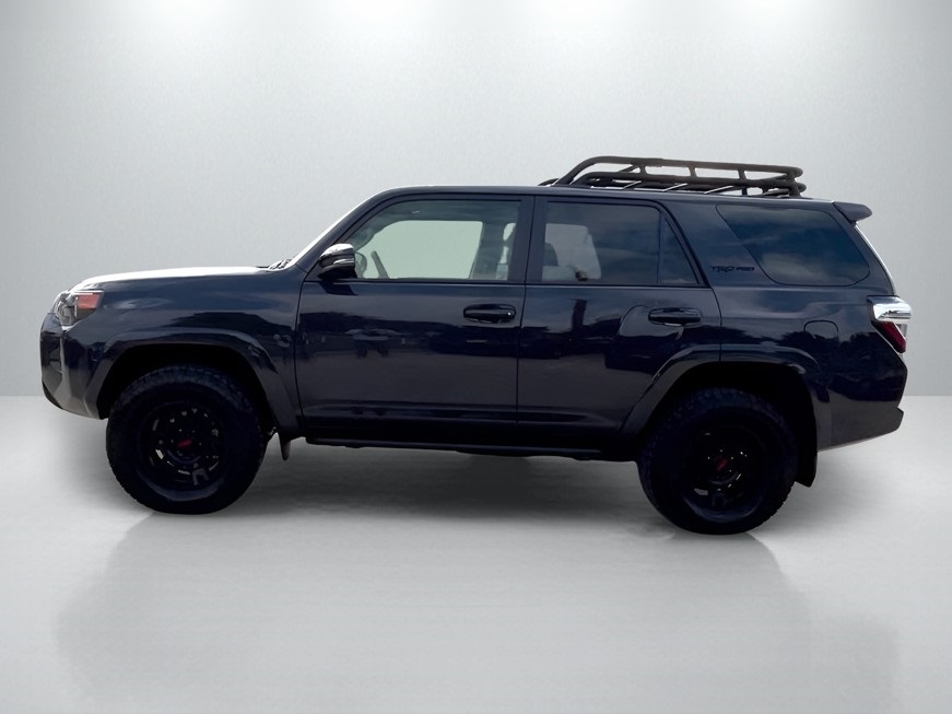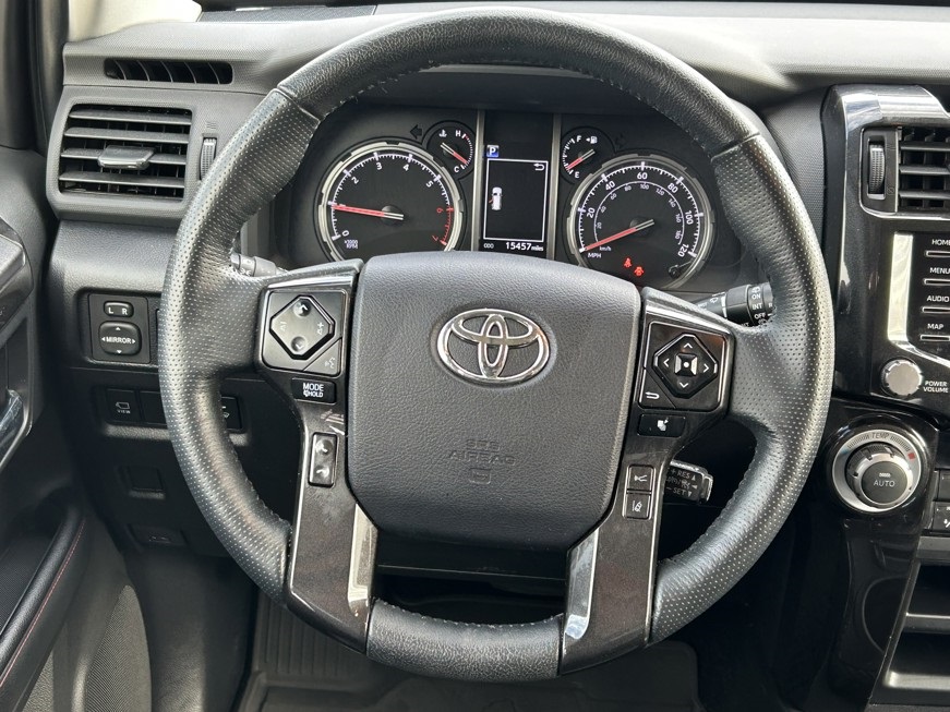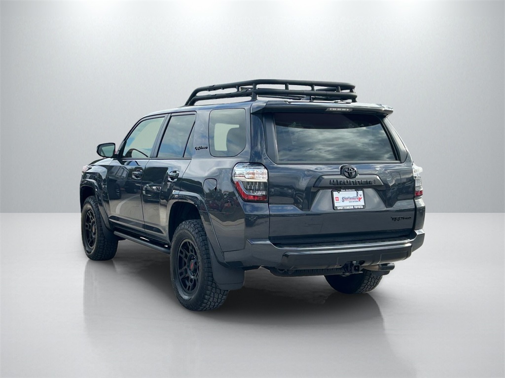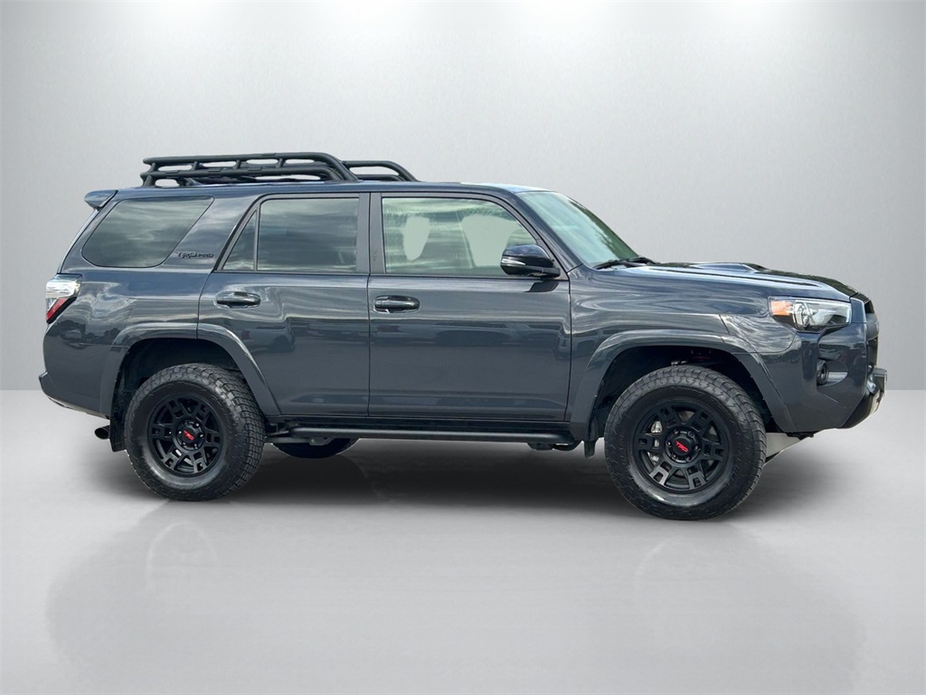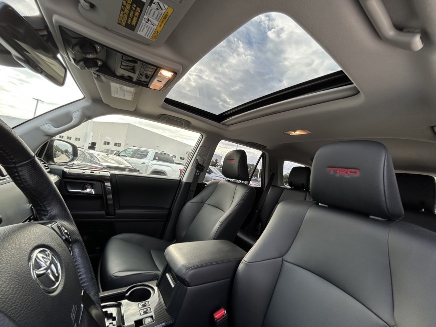 CARFAX One-Owner. Clean CARFAX. 4WD, Graphite Artificial Leather, 15 Speakers, 3.727 Axle Ratio, 4-Wheel Disc Brakes, ABS brakes, Air Conditioning, Alloy wheels, AM/FM radio: SiriusXM, Anti-whiplash front head restraints, Apple CarPlay/Android Auto, Auto High-beam Headlights, Auto-dimming Rear-View mirror, Automatic temperature control, Black Lug Nuts, Blackout Emblem Overlays (TMS), Brake assist, Bumpers: body-color, Cargo Cover (TMS), Cargo Mat (TMS), Cargo Tote (TMS), Cargo Tray (TMS), Cement-Colored Molded 4Runner Cooler (TMS), Compass, Console Safe (TMS), Door Edge Guard (TMS), Driver door bin, Driver vanity mirror, Dual front impact airbags, Dual front side impact airbags, Dual Zone Auto Climate Control, Electronic Stability Control, Emergency Assistance Kit (TMS), Emergency communication system: Safety Connect (1-year trial), Fog Lights, Fox Shocks, Front anti-roll bar, Front Bucket Seats, Front Center Armrest, Front Dual USB Power Port Charger (TMS), Front dual zone A/C, Front fog lights, Front reading lights, Front wheel independent suspension, Garage Door Opener, Garage door transmitter: HomeLink, Heated door mirrors, Heated Front Bucket Seats, Heated front seats, Heated Outside Rear-View Mirrors, Heated steering wheel, Hitch Ball Mount (TMS), Illuminated entry, Knee airbag, Leather Shift Knob, Low tire pressure warning, Moonroof w/Tilt Up & Slide, Multi-Terrain Back Monitor, Navigation System, Occupant sensing airbag, Outside temperature display, Overhead airbag, Overhead console, Panic alarm, Passenger door bin, Passenger vanity mirror, Power door mirrors, Power driver seat, Power moonroof, Power passenger seat, Power steering, Power windows, Quick Charge Cable (TMS), Radio: Premium Audio w/JBL, Rear anti-roll bar, Rear seat center armrest, Rear window defroster, Rear window wiper, Remote keyless entry, Roof rack, Roof Rack, Security system, Sliding Rear Cargo Deck, SofTex Seat Trim, Speed control, Speed-sensing steering, Split folding rear seat, Spoiler, Steering wheel mounted audio controls, Tachometer, Telescoping steering wheel, Tilt steering wheel, Traction control, TRD Pro All Weather Floor Liner, TRD Pro Badging, TRD PRO Carpet Floor Mats (TMS), TRD Pro Exhaust, TRD Pro Package, TRD Shift Knob, Trip computer, Trunk Carpet, Universal Tablet Holder (TMS), Variably intermittent wipers, Wheel Locks, Wheels: 17" Matte Black Flow-Formed TRD Alloy.