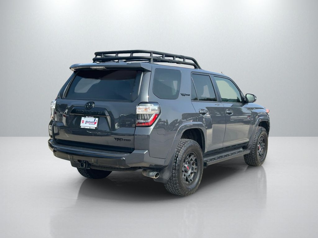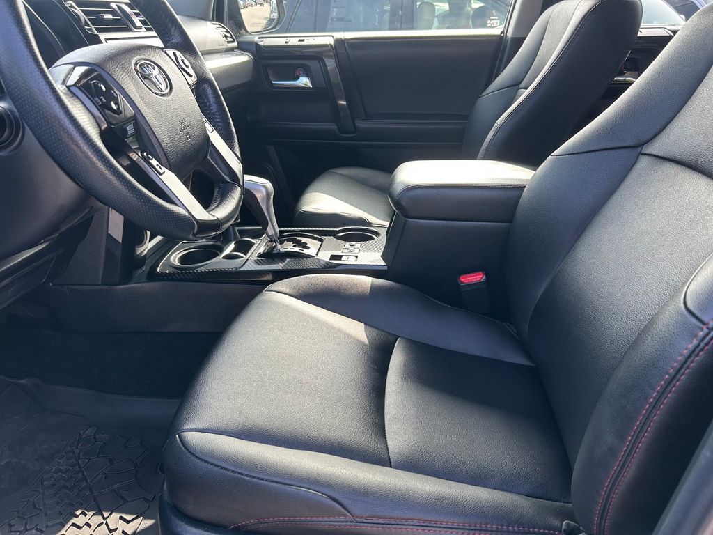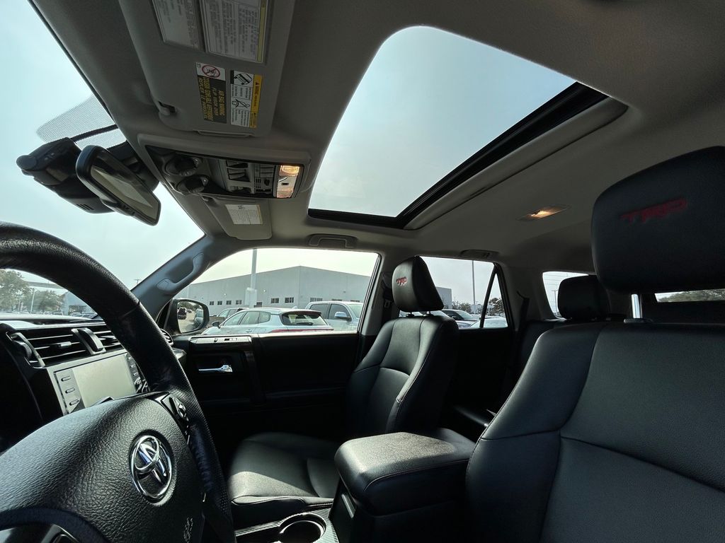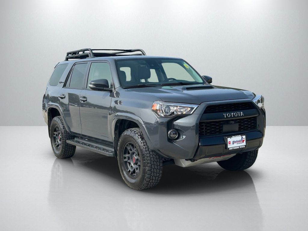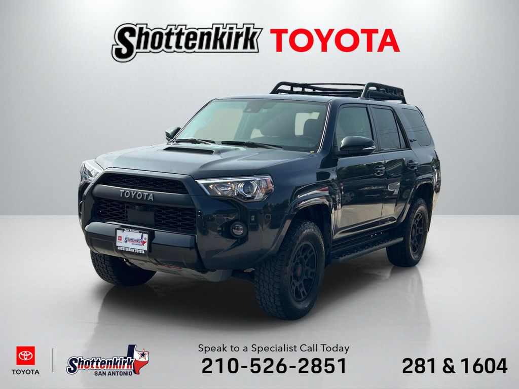 CARFAX One-Owner. Clean CARFAX. 4WD, Black/Graphite w/SofTex Seat Trim, 15 Speakers, 3.727 Axle Ratio, 4-Wheel Disc Brakes, ABS brakes, Air Conditioning, Alloy wheels, AM/FM radio: SiriusXM, Anti-whiplash front head restraints, Apple CarPlay/Android Auto, Auto High-beam Headlights, Auto-dimming Rear-View mirror, Automatic temperature control, Black Lug Nuts, Brake assist, Bumpers: body-color, Compass, Driver door bin, Driver vanity mirror, Dual front impact airbags, Dual front side impact airbags, Dual Zone Auto Climate Control, Electronic Stability Control, Emergency communication system: Safety Connect (1-year trial), Exterior Parking Camera Rear, Fog Lights, Fox Shocks, Front anti-roll bar, Front Bucket Seats, Front Center Armrest, Front dual zone A/C, Front fog lights, Front reading lights, Front wheel independent suspension, Garage Door Opener, Garage door transmitter: HomeLink, Heated door mirrors, Heated Front Bucket Seats, Heated front seats, Heated Outside Rear-View Mirrors, Heated steering wheel, Illuminated entry, Knee airbag, Leather Shift Knob, Low tire pressure warning, Moonroof w/Tilt Up & Slide, Multi-Terrain Back Monitor, Navigation System, Occupant sensing airbag, Outside temperature display, Overhead airbag, Overhead console, Panic alarm, Passenger door bin, Passenger vanity mirror, Power door mirrors, Power driver seat, Power moonroof, Power passenger seat, Power steering, Power windows, Radio: Premium Audio w/JBL, Rear anti-roll bar, Rear seat center armrest, Rear window defroster, Rear window wiper, Remote keyless entry, Roof rack, Roof Rack, Security system, SofTex Seat Trim, Speed control, Speed-sensing steering, Split folding rear seat, Spoiler, Steering wheel mounted audio controls, Tachometer, Telescoping steering wheel, Tilt steering wheel, Traction control, TRD Pro All Weather Floor Liner, TRD Pro Badging, TRD Pro Exhaust, TRD Shift Knob, Trip computer, Variably intermittent wipers, Wheel Locks, Wheels: 17" Matte Black Flow-Formed TRD Alloy.