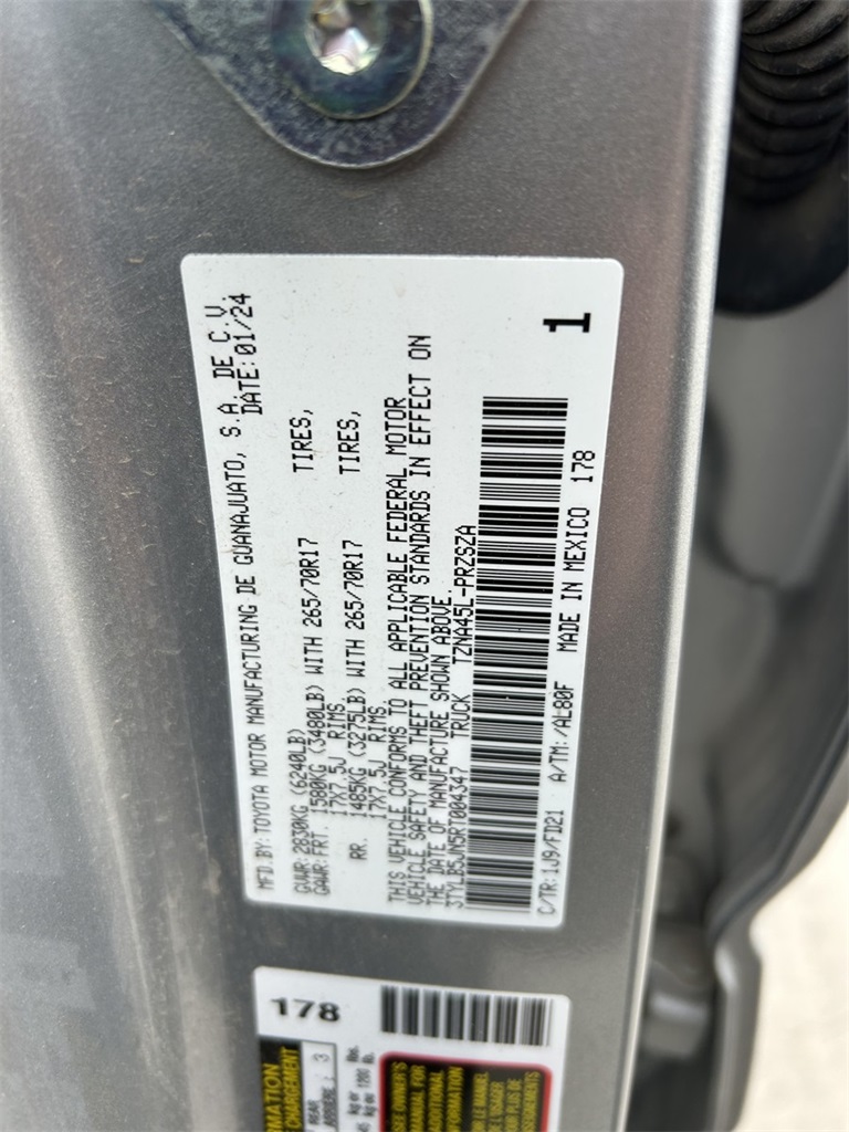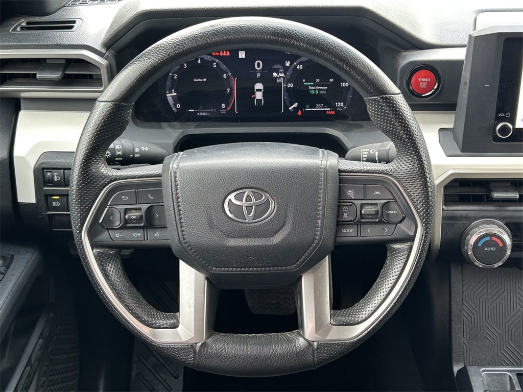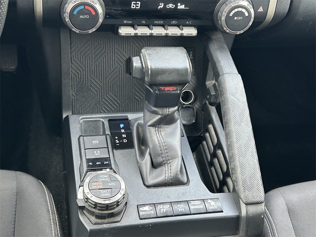 4WD, 3.583 Axle Ratio, 4-Wheel Disc Brakes, 6 Speakers, ABS brakes, Air Conditioning, Alloy wheels, AM/FM radio: SiriusXM, Anti-whiplash front head restraints, Apple CarPlay/Android Auto, Auto High-beam Headlights, Auto-dimming Rear-View mirror, Automatic temperature control, Brake assist, Bumpers: body-color, Driver door bin, Driver vanity mirror, Dual front impact airbags, Dual front side impact airbags, Electronic Stability Control, Emergency communication system: Safety Connect (1-year trial), Exterior Parking Camera Rear, Fabric Seat Trim (FD), Four wheel independent suspension, Front anti-roll bar, Front Bucket Seats, Front Center Armrest, Front fog lights, Front reading lights, Fully automatic headlights, Heated door mirrors, Illuminated entry, Knee airbag, Leather Shift Knob, Leather steering wheel, Low tire pressure warning, Occupant sensing airbag, Outside temperature display, Overhead airbag, Overhead console, Panic alarm, Passenger door bin, Passenger vanity mirror, Power door mirrors, Power steering, Power windows, Radio: 8" Toyota Audio Multimedia, Rear step bumper, Rear window defroster, Remote keyless entry, Security system, Speed control, Speed-sensing steering, Split folding rear seat, Steering wheel mounted audio controls, Tachometer, Telescoping steering wheel, Tilt steering wheel, Traction control, Trip computer, Turn signal indicator mirrors, Variably intermittent wipers, Wheels: 17" TRD Off-Road Alloy.