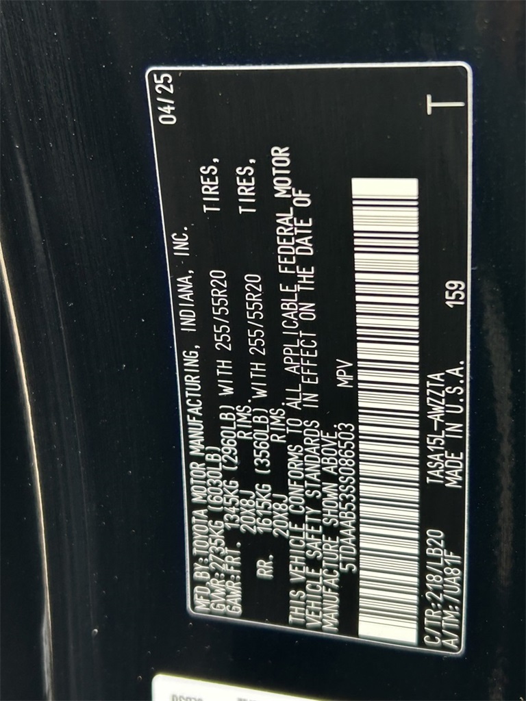 CARFAX One-Owner. 11 Speakers, 3rd row seats: split-bench, 4-Wheel Disc Brakes, ABS brakes, Air Conditioning, All Weather Floor Liners/Cargo Tray (TMS), Alloy wheels, AM/FM radio: SiriusXM, Apple CarPlay/Android Auto, Auto High-beam Headlights, Auto-dimming Rear-View mirror, Automatic temperature control, Brake assist, Bumpers: body-color, Dashcam (TMS), Delay-off headlights, Driver door bin, Driver vanity mirror, Dual front impact airbags, Dual front side impact airbags, Electronic Stability Control, Emergency communication system: Safety Connect (up to 10-year trial subscription), Exterior Parking Camera Rear, Four wheel independent suspension, Front anti-roll bar, Front Bucket Seats, Front Center Armrest, Front dual zone A/C, Front fog lights, Front reading lights, Fully automatic headlights, Garage door transmitter: HomeLink, Heads-Up Display, Heated & Ventilated Front Seats, Heated door mirrors, Heated front seats, Heated rear seats, Heated steering wheel, Illuminated entry, Key Glove Set (TMS), Knee airbag, Leather Seat Trim, Leather Shift Knob, Leather steering wheel, Low tire pressure warning, Memory seat, Navigation system: Drive Connect Cloud Navigation (1-year trial subscription), Occupant sensing airbag, Outside temperature display, Overhead airbag, Overhead console, Panic alarm, Passenger door bin, Passenger vanity mirror, Power door mirrors, Power driver seat, Power Liftgate, Power passenger seat, Power steering, Power windows, Radio: 12.3" Toyota Audio Multimedia w/JBL Premium, Rain sensing wipers, Rear air conditioning, Rear anti-roll bar, Rear reading lights, Rear window defroster, Rear window wiper, Reclining 3rd row seat, Remote keyless entry, Security system, Speed control, Speed-sensing steering, Split folding rear seat, Spoiler, Steering wheel mounted audio controls, Tachometer, Telescoping steering wheel, Tilt steering wheel, Traction control, Trip computer, Turn signal indicator mirrors, Variably intermittent wipers, Ventilated front seats, Ventilated rear seats, Wheels: 20" Silver Multi-Spoke Alloy.