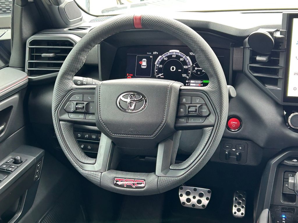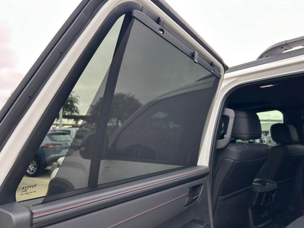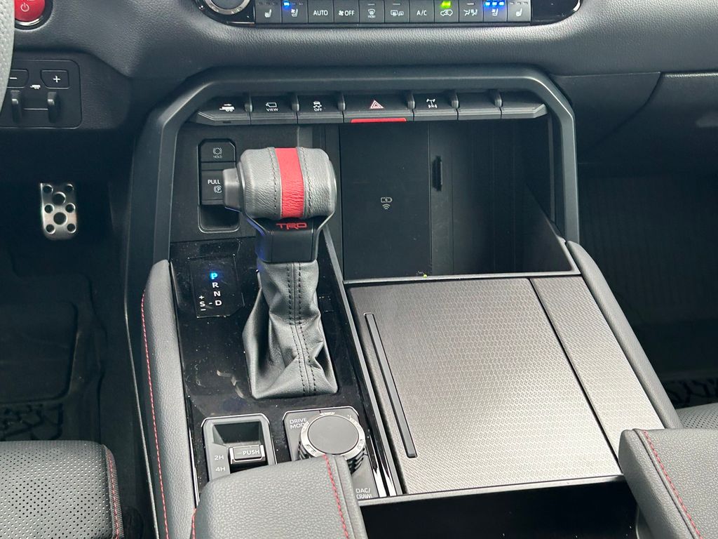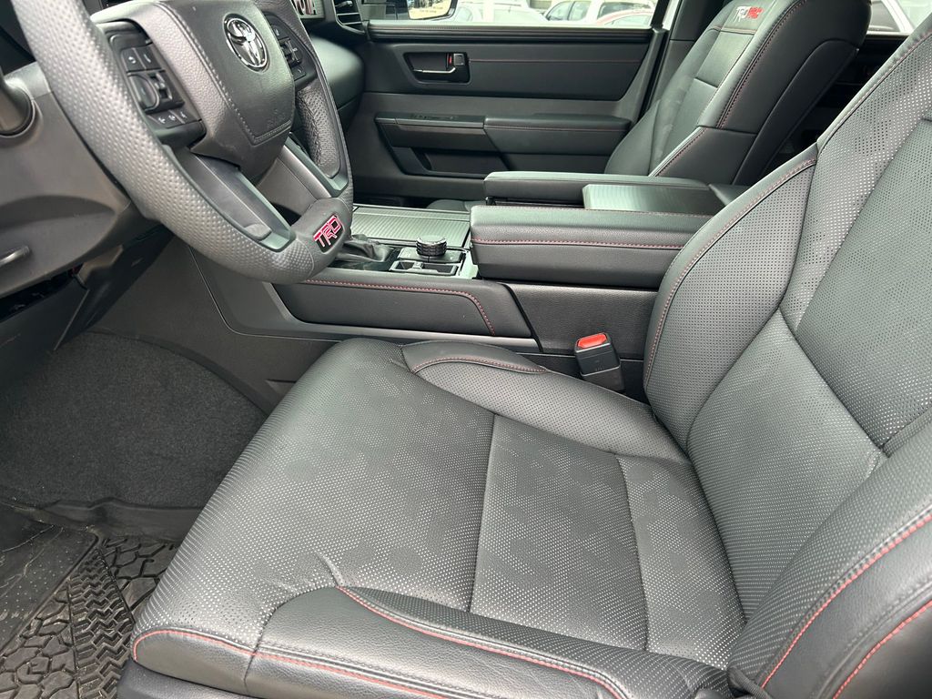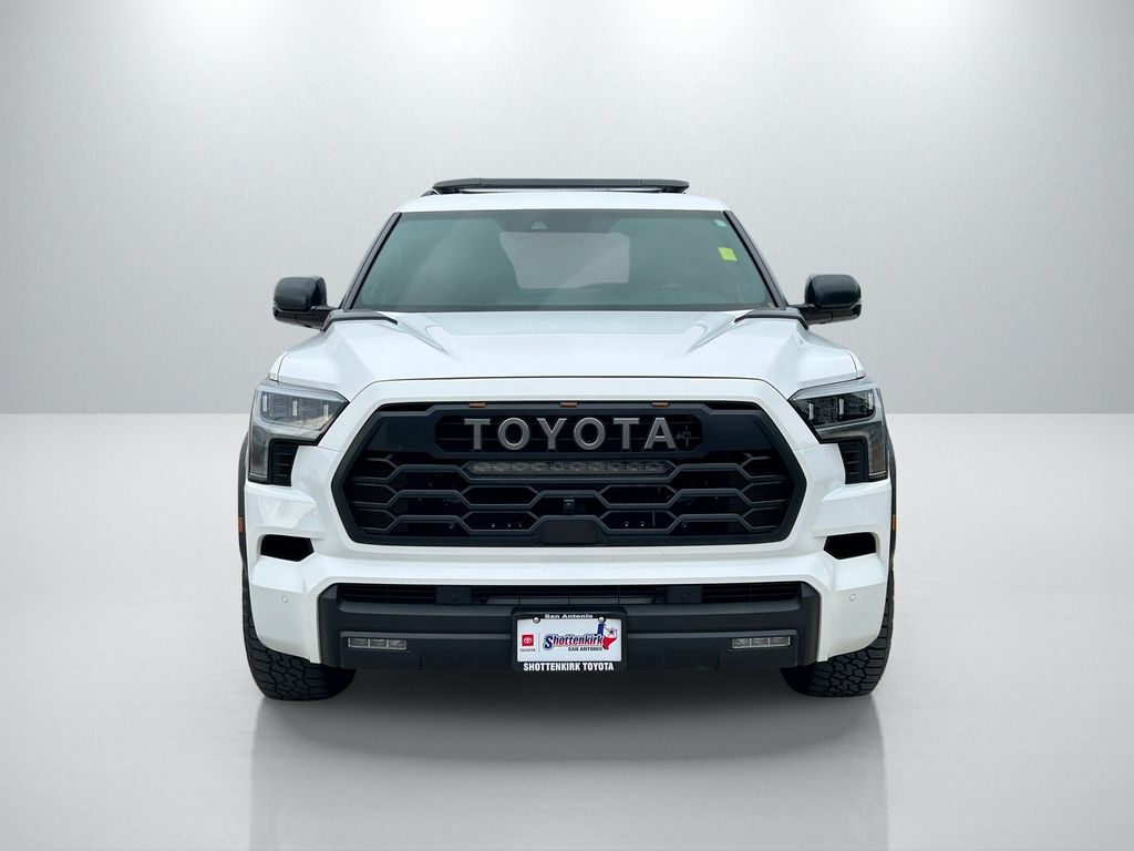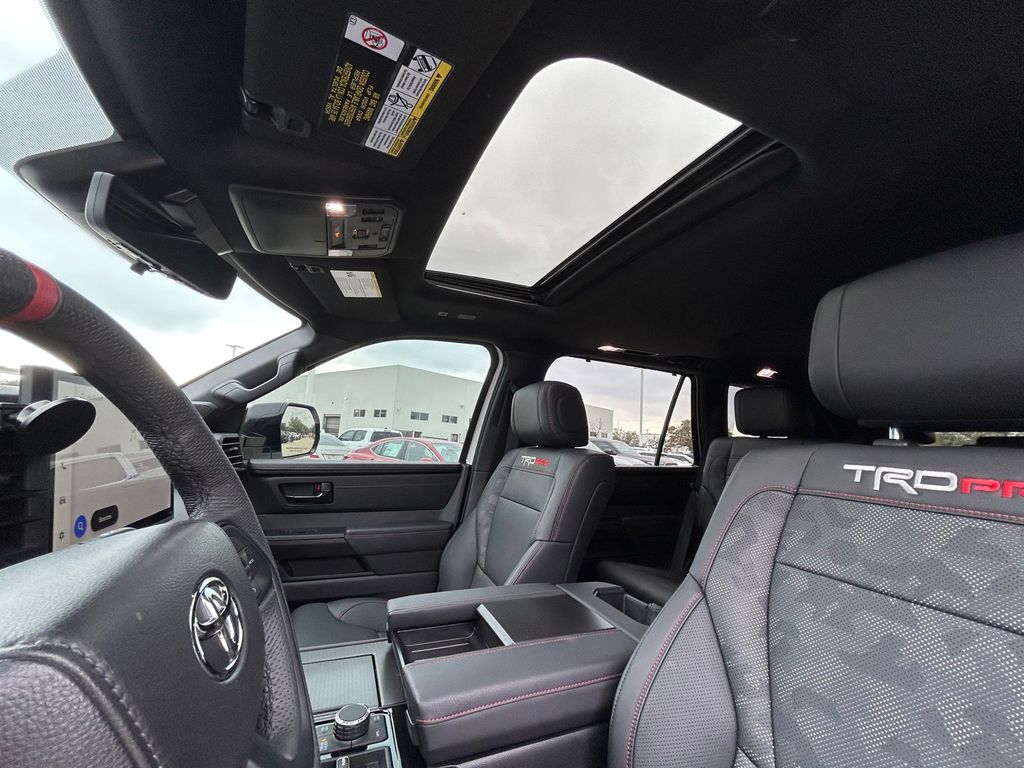CARFAX One-Owner. Clean CARFAX. V6 Hybrid, 10-Speed Automatic, 4WD, 14 Speakers, 3rd row seats: split-bench, 4-Wheel Disc Brakes, ABS brakes, Air Conditioning, Alloy wheels, AM/FM radio: SiriusXM, Anti-whiplash front head restraints, Apple CarPlay/Android Auto, Auto High-beam Headlights, Auto-dimming door mirrors, Auto-dimming Rear-View mirror, Automatic temperature control, Brake assist, Bumpers: body-color, Compass, Delay-off headlights, Driver door bin, Driver vanity mirror, Dual front impact airbags, Dual front side impact airbags, Electronic Stability Control, Emergency communication system: Safety Connect (10-year trial), Exterior Parking Camera Rear, Front anti-roll bar, Front Bucket Seats, Front Center Armrest w/Storage, Front dual zone A/C, Front fog lights, Front reading lights, Front wheel independent suspension, Fully automatic headlights, Garage door transmitter: HomeLink, Headlight cleaning, Heated & Ventilated Front Seats, Heated door mirrors, Heated front seats, Heated steering wheel, Illuminated entry, Knee airbag, Leather Shift Knob, Leather steering wheel, Low tire pressure warning, Memory seat, Navigation system: Drive Connect (1 year trial) includes Cloud Navigation with real time traffic and Google POI, Occupant sensing airbag, Outside temperature display, Overhead airbag, Overhead console, Panic alarm, Passenger door bin, Passenger vanity mirror, Power door mirrors, Power driver seat, Power Liftgate, Power moonroof, Power passenger seat, Power steering, Power windows, Premium audio system: JBL, Radio: 14" Toyota Audio Multimedia w/JBL Prem Aud, Rear air conditioning, Rear reading lights, Rear seat center armrest, Rear window defroster, Rear window wiper, Reclining 3rd row seat, Remote keyless entry, Security system, Speed control, Speed-sensing steering, Split folding rear seat, Spoiler, Sport steering wheel, Steering wheel mounted audio controls, Tachometer, Telescoping steering wheel, Tilt steering wheel, Traction control, TRD Performance Package (TMS), TRD Pro Package, TRD Pro SofTex Seat Trim, TRD Windshield UV Sunshade (TMS), Trip computer, Turn signal indicator mirrors, Variably intermittent wipers, Ventilated front seats, Voltmeter, Wheels: 18" TRD Pro Forged-Aluminum BBS.