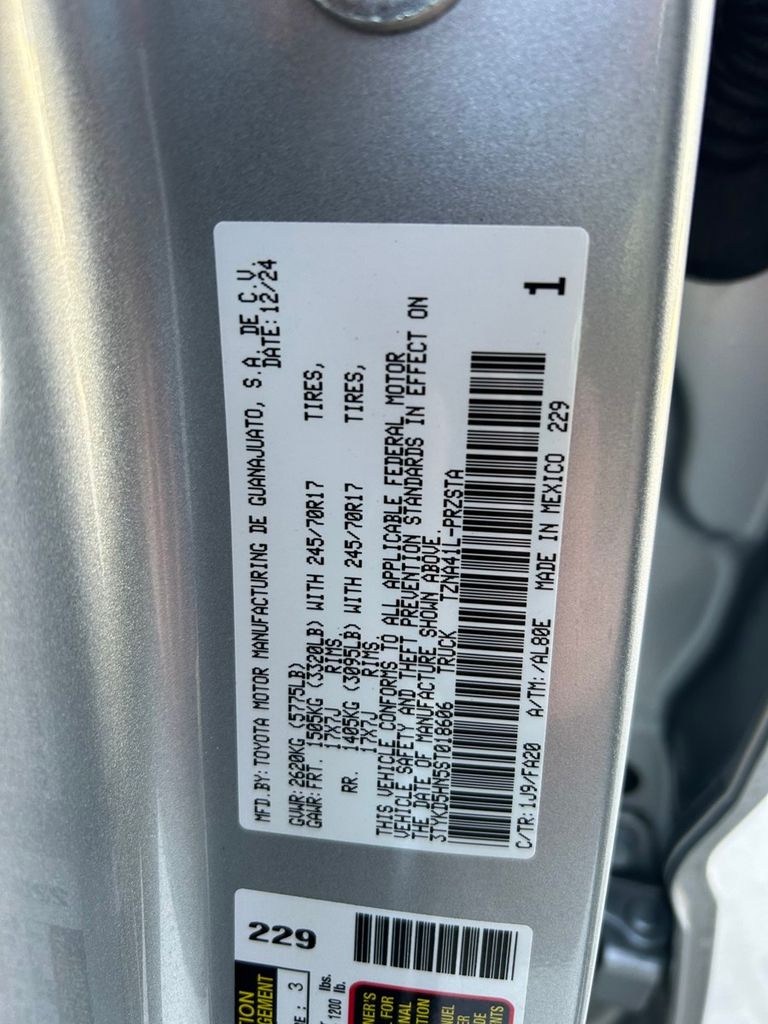 CARFAX One-Owner. Clean CARFAX. 3.583 Axle Ratio, 4-Wheel Disc Brakes, 6 Speakers, ABS brakes, Air Conditioning, Alloy wheels, AM/FM radio: SiriusXM, Anti-whiplash front head restraints, Apple CarPlay/Android Auto, Auto High-beam Headlights, Brake assist, Bumpers: body-color, Driver door bin, Dual front impact airbags, Dual front side impact airbags, Electronic Stability Control, Emergency communication system: Safety Connect (1-year trial), Exterior Parking Camera Rear, Fabric Seat Trim, Front anti-roll bar, Front Bucket Seats, Front Center Armrest, Front reading lights, Front wheel independent suspension, Fully automatic headlights, Heated door mirrors, Illuminated entry, Knee airbag, Low tire pressure warning, Occupant sensing airbag, Outside temperature display, Overhead airbag, Overhead console, Passenger door bin, Power door mirrors, Power steering, Power windows, Radio: 8" Toyota Audio Multimedia, Rear step bumper, Rear window defroster, Remote keyless entry, Speed control, Speed-sensing steering, Split folding rear seat, Spray-On Bed Liner (TMS), Steering wheel mounted audio controls, Tachometer, Telescoping steering wheel, Tilt steering wheel, Traction control, Trip computer, Variably intermittent wipers, Wheels: 17" Styled Alloy.